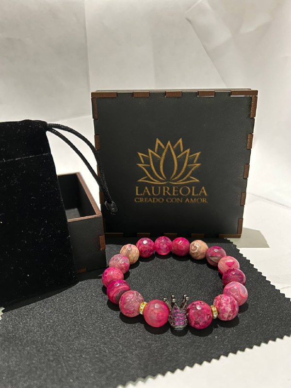 Compuesta de piedra ágata rosa ideal para liberarte del estrés, absorbe las energías negativas, mejora la concentración y protege de los malos sueños.